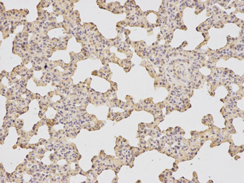 Immunohistochemical analysis of paraffin-embedded rat lung using ATF6 antibody at dilution of 1:200 (200x lens).