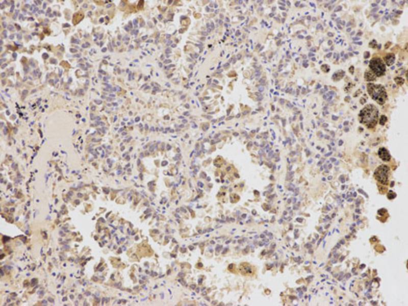 Immunohistochemical analysis of paraffin-embedded human lung cancer using ATF6 antibody at dilution of 1:200 (200x lens).