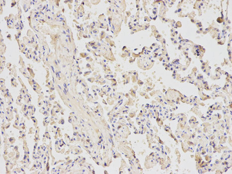 Immunohistochemical analysis of paraffin-embedded human lung using ATF6 antibody at dilution of 1:200 (200x lens).