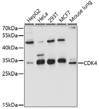 Western blot analysis of extracts of various cell lines, using CDK4 antibody.