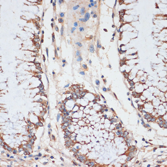 Immunohistochemistry of paraffin-embedded human colon using CDK4 antibody.