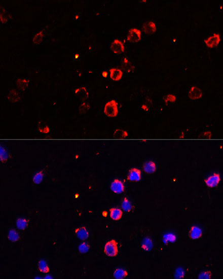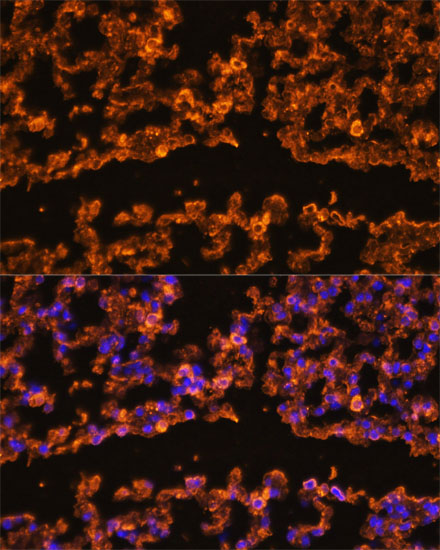 Immunofluorescence analysis of mouse lung using IL1 beta Polyclonal antibody at dilution of 1:100 (40x lens). Blue: DAPI for nuclear staining.