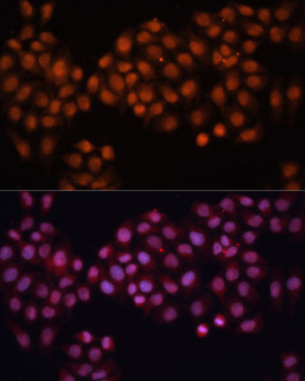 Immunofluorescence analysis of HeLa cells using CDC25A Polyclonal antibody at dilution of 1:100 (40x lens). Blue: DAPI for nuclear staining.
