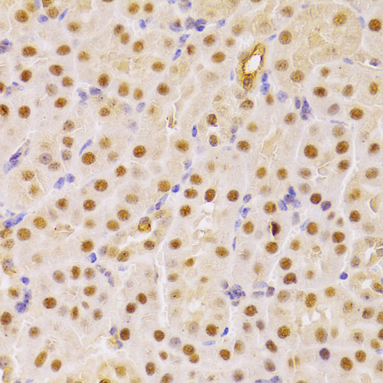 Immunohistochemistry of paraffin-embedded mouse kidney using CDC25A antibody at dilution of 1:100 (40x lens).