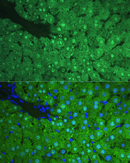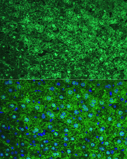 Immunofluorescence analysis of Mouse liver using ARG1 / Arginase 1 antibody at dilution of 1:100. Blue: DAPI for nuclear staining.