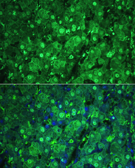 Immunofluorescence analysis of Human liver using ARG1 / Arginase 1 antibody at dilution of 1:100. Blue: DAPI for nuclear staining.