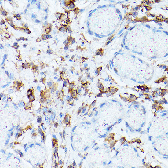 Immunohistochemistry of paraffin-embedded human gastric cancer using ICAM-1/CD54 Rabbit pAb.