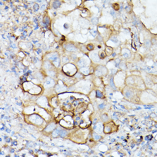 Immunohistochemistry of paraffin-embedded human lung cancer using ICAM-1/CD54 Rabbit pAb.