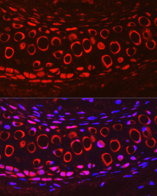 Immunofluorescence analysis of paraffinembedded Mouse cartilage using COMP Antibody at dilution of 1:200 (40x lens);