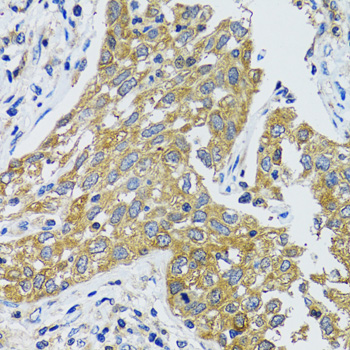 Immunohistochemistry of paraffin-embedded human lung cancer using GOT1 antibody at dilution of 1:100 (40x lens).