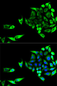 Immunofluorescence analysis of U2OS cells using GOT1 antibody. Blue: DAPI for nuclear staining.
