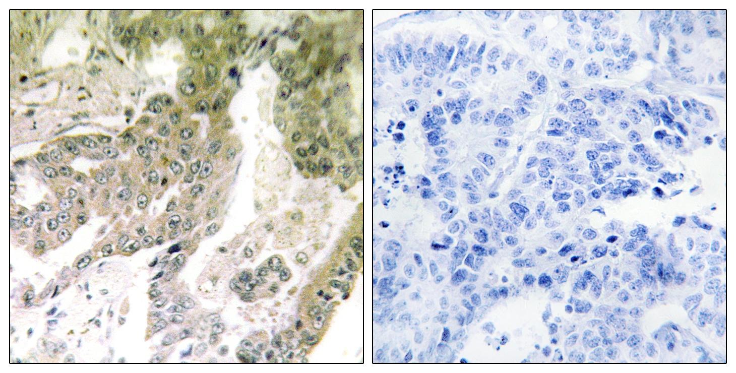 Immunohistochemistry analysis of paraffin-embedded human lung carcinoma tissue, using LAMA5 Antibody. The picture on the right is blocked with the synthesized peptide.