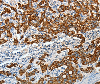 Immunohistochemical analysis of paraffin-embedded Human gastric cancer tissue using #35624 at dilution 1/50.
