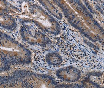 Immunohistochemical analysis of paraffin-embedded Human colon cancer tissue using #37666 at dilution 1/40.