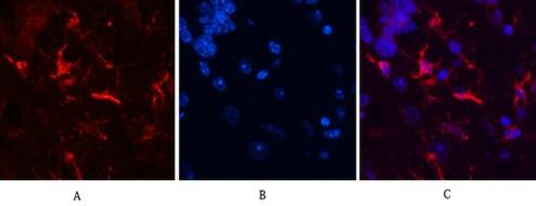 Immunofluorescence analysis of Mouse-brain tissue. 1,GFAP Monoclonal Antibody(5C8)(red) was diluted at 1:200(4°C,overnight). 2, Cy3 labled Secondary antibody was diluted at 1:300(room temperature, 50min).3, Picture B: DAPI(blue) 10min. Picture A:Target. Picture B: DAPI. Picture C: merge of A+B