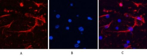 Immunofluorescence analysis of Rat-brain tissue. 1,GFAP Monoclonal Antibody(5C8)(red) was diluted at 1:200(4°C,overnight). 2, Cy3 labled Secondary antibody was diluted at 1:300(room temperature, 50min).3, Picture B: DAPI(blue) 10min. Picture A:Target. Picture B: DAPI. Picture C: merge of A+B