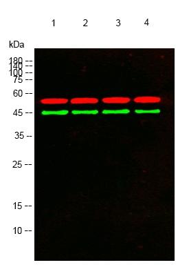 Western blot analysis of lysates from 1) Rat Brain Tissue, 2)HeLa , 3)A431, 4) PC12 cells, (Green) primary antibody was diluted at 1:1000, 4°over night, secondary antibody was diluted at 1:10000, 37° 1hour. (Red) Tubulin β Polyclonal Antibody antibody was diluted at 1:5000 as loading control, 4° over night,secondary antibody was diluted at 1:10000, 37° 1hour.