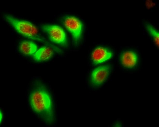 Immunofluorescence analysis of Hela cell. 1,AR Polyclonal Antibody(red) was diluted at 1:200(4° overnight). GFAP Monoclonal Antibody(5C8)(green) was diluted at 1:200(4° overnight). 2, Goat Anti Rabbit Alexa Fluor 594 was diluted at 1:1000(room temperature, 50min). Goat Anti Mouse Alexa Fluor 488 was diluted at 1:1000(room temperature, 50min).