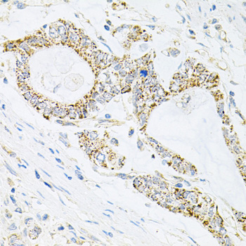 Immunohistochemistry of paraffin-embedded human gastric cancer using IRS1 antibody at dilution of 1:100 (40x lens).