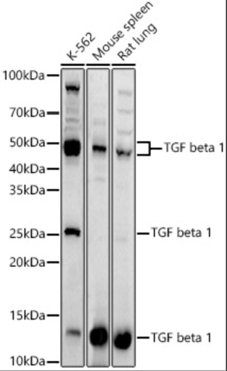 Western blot analysis of various lysates, using TGF beta 1 Rabbit pAb at 1:2000 dilution.Secondary antibody: HRP-conjugated Goat anti-Rabbit IgG (H+L) at 1:10000 dilution.