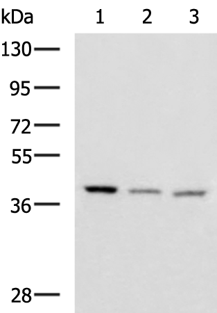 Gel: 8%SDS-PAGE, Lysate: 40 μg, Lane 1-3: Human cerebrum tissue, Human cerebella tissue, Mouse brain tissue lysates, Primary antibody:ENKD1 Antibody at dilution 1/1150, Secondary antibody: Goat anti rabbit IgG at 1/5000 dilution, Exposure time: 3 minutes