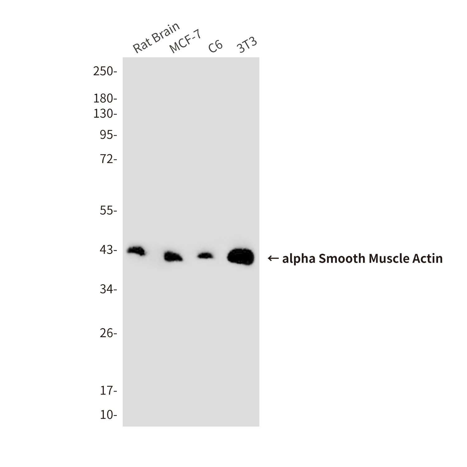 Western blot analysis of alpha Smooth Muscle Actin in αSmooth Muscle Actin in rat Brain, MCF-7, C6 and 3T3 lysates using alpha Smooth Muscle Actin antibody