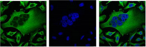 IF analysis of Hela with β-Tubulin Monoclonal Antibody(Left) and DAPI (Right) diluted at 1:100.