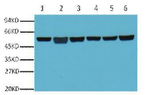 Western blot analysis of A549 (1), Rat brain (2), Mouse brain (3), Chicken lung (4) and Rabbit testis (5), Sheep muscle (6), diluted at 1:5000.
