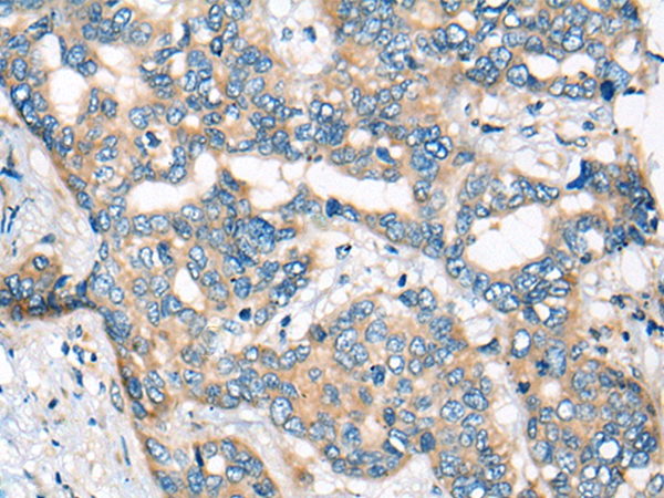 The image on the left is immunohistochemistry of paraffin-embedded Human esophagus cancer tissue using 46478(CEP72 Antibody) at dilution 1/40, on the right is treated with fusion protein. (Original magnification: x200)