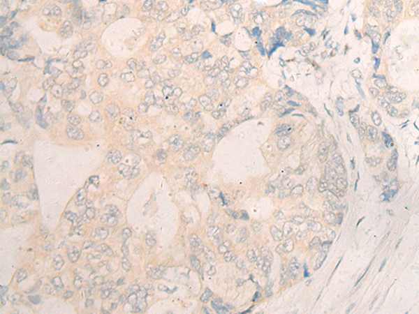 The image is immunohistochemistry of paraffin-embedded Human gastric cancer tissue using 47022(DBX1 Antibody) at dilution 1/20. (Original magnification: ?00)