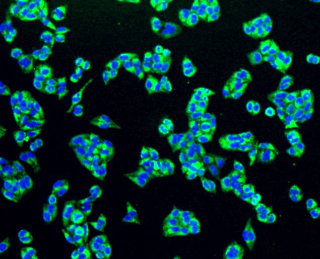 ICC staining PBR in PC-3M cells (green). The nuclear counter stain is DAPI (blue). Cells were fixed in paraformaldehyde, permeabilised with 0.25% Triton X100/PBS.