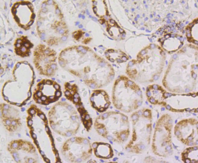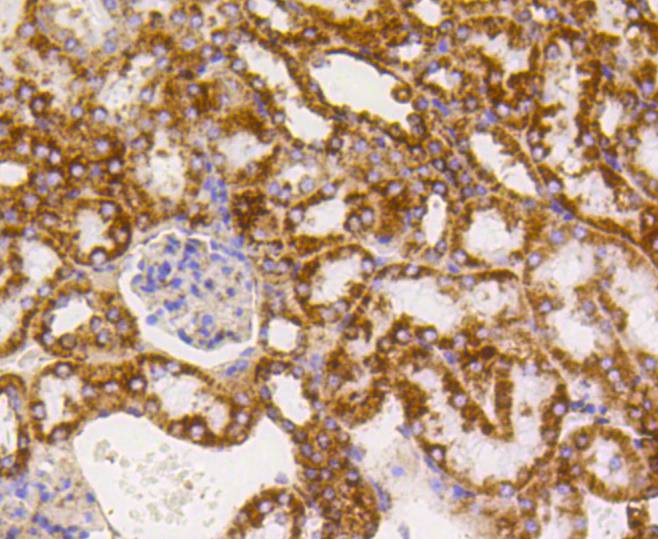Immunohistochemical analysis of paraffin-embedded mouse kidney tissue using anti-PBR antibody. Counter stained with hematoxylin.