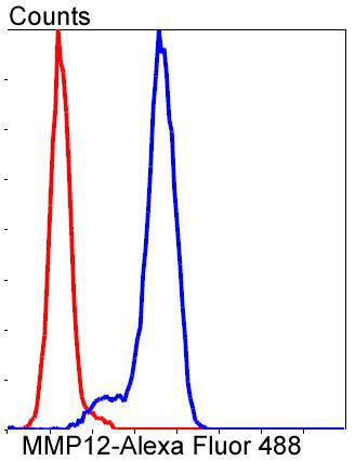 Flow cytometric analysis of A549 cells with MMP12 antibody at 1/50 dilution (blue) compared with an unlabelled control (cells without incubation with primary antibody; red). Alexa Fluor 488-conjugated goat anti rabbit IgG was used as the secondary antibody.
