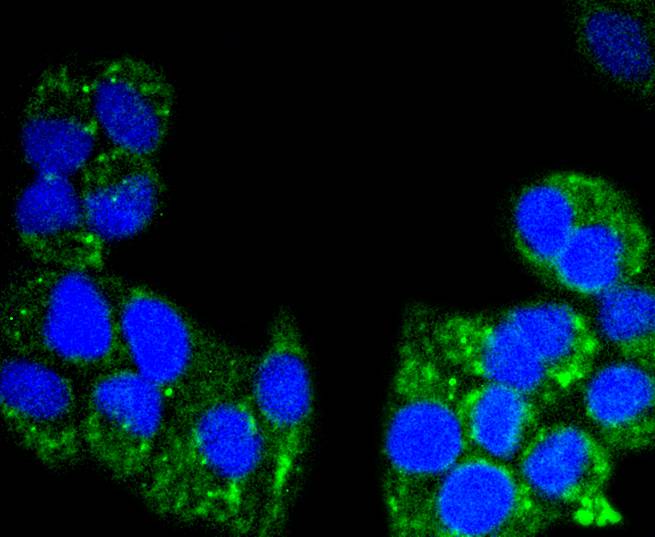 ICC staining AIF in HepG2 cells (green). The nuclear counter stain is DAPI (blue). Cells were fixed in paraformaldehyde, permeabilised with 0.25% Triton X100/PBS.