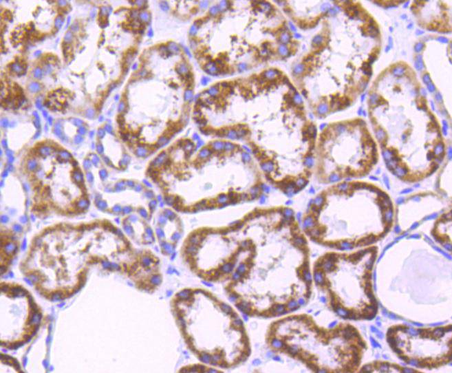Immunohistochemical analysis of paraffin-embedded human kidney tissue using anti-AIF antibody. Counter stained with hematoxylin.