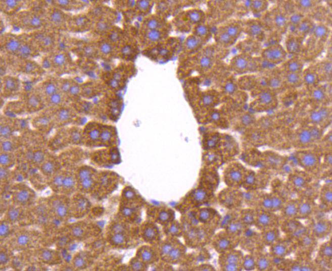 Immunohistochemical analysis of paraffin-embedded mouse liver tissue using anti-AIF antibody. Counter stained with hematoxylin.