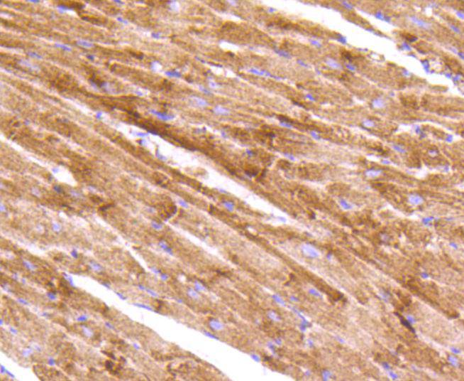 Immunohistochemical analysis of paraffin-embedded mouse heart tissue using anti-AIF antibody. Counter stained with hematoxylin.