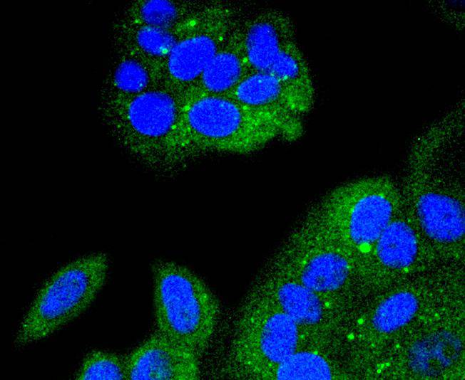 ICC staining IKB alpha in Hela cells (green). The nuclear counter stain is DAPI (blue). Cells were fixed in paraformaldehyde, permeabilised with 0.25% Triton X100/PBS.
