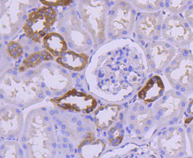 Immunohistochemical analysis of paraffin-embedded mouse kidney tissue using anti-IKB alpha antibody. Counter stained with hematoxylin.