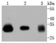 Western blot analysis of IKB alpha on different lysates using anti-IKB alpha antibody at 1/1,000 dilution. Positive control: Lane 1: PC-12 Lane 2: NIH/3T3 Lane 3: Hela