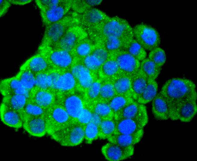 ICC staining PTEN in SW480 cells (green). The nuclear counter stain is DAPI (blue). Cells were fixed in paraformaldehyde, permeabilised with 0.25% Triton X100/PBS.