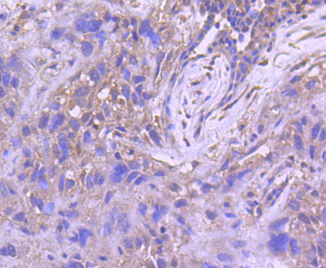 Immunohistochemical analysis of paraffin-embedded human breast carcinoma tissue using anti-PTEN antibody. Counter stained with hematoxylin.