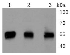 Western blot analysis of PTEN on different lysates using anti-PTEN antibody at 1/1,000 dilution. Positive control: Lane 1: MCF-7 Lane 2: Hela Lane 3: 293T
