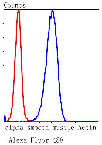 Flow cytometric analysis of Hela cells with alpha smooth muscle Actin antibody at 1/50 dilution (blue) compared with an unlabelled control (cells without incubation with primary antibody; red). Alexa Fluor 488-conjugated goat anti rabbit IgG was used as the secondary antibody.