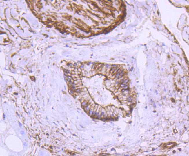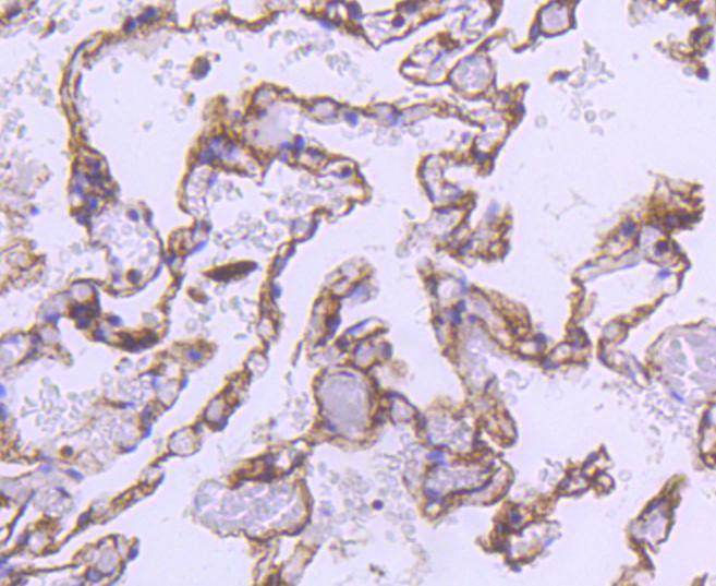 Immunohistochemical analysis of paraffin-embedded human lung tissue using anti-alpha smooth muscle Actin antibody. Counter stained with hematoxylin.