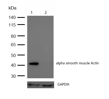 All lanes:alpha smooth muscle Actin Rabbit mAb at 1/1k dilutionLane 1 : Wild-type Hela cell lysateLane 2 : alpha smooth muscle Actin knockdown Hela cell lysateLysates/proteins at 20 µg per lane.