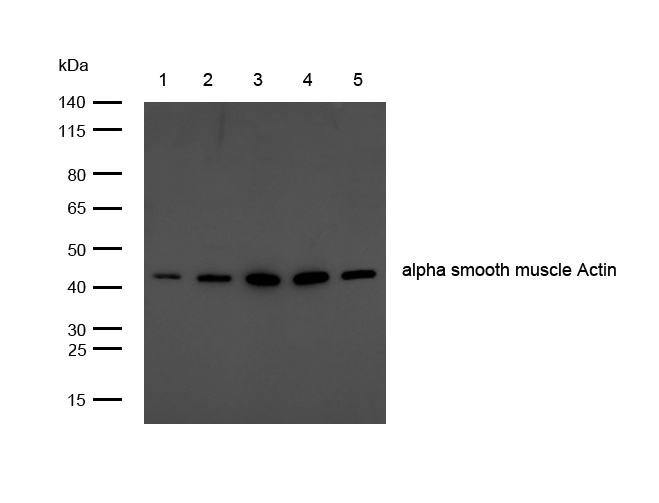 All lanes: alpha smooth muscle Actin Rabbit mAb at 1/1k dilutionLane 1 : 293 whole cell lysates Lane 2 : A549 whole cell lysates Lane 3 : C2C12 whole cell lysates Lane 4 : PC12 whole cell lysates Lane 5 : C6 whole cell lysates Lysates/proteins at 20 µg per lane.SecondaryAll lanes : Goat Anti-Rabbit IgG H&L (HRP) at 1/20000 dilutionPredicted band size: 42 kDa Observed band size: 42 kDaExposure time: 6 seconds