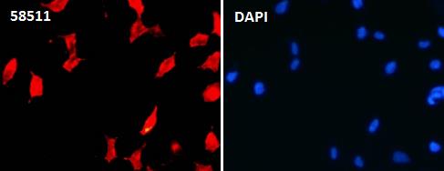 Immunocytochemistry/ Immunofluorescence alpha smooth muscle Actin antibody (48785) ICC/IF staining of alpha smooth muscle Actin in 293T cells. Cells were fixed with 4% Paraformaldehyde permeabilized with 0.1% Triton X-100. Samples were incubated with 48785 at a working dilution of 1/100. The secondary antibody was Alexa Fluor® 647 goat anti rabbit, used at a dilution of 1/500. Nuclei were counterstained with DAPI.