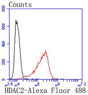 Flow cytometric analysis of Hela cells with HDAC2 antibody at 1/50 dilution (red) compared with an unlabelled control (cells without incubation with primary antibody; black). Alexa Fluor 488-conjugated goat anti rabbit IgG was used as the secondary antibody.
