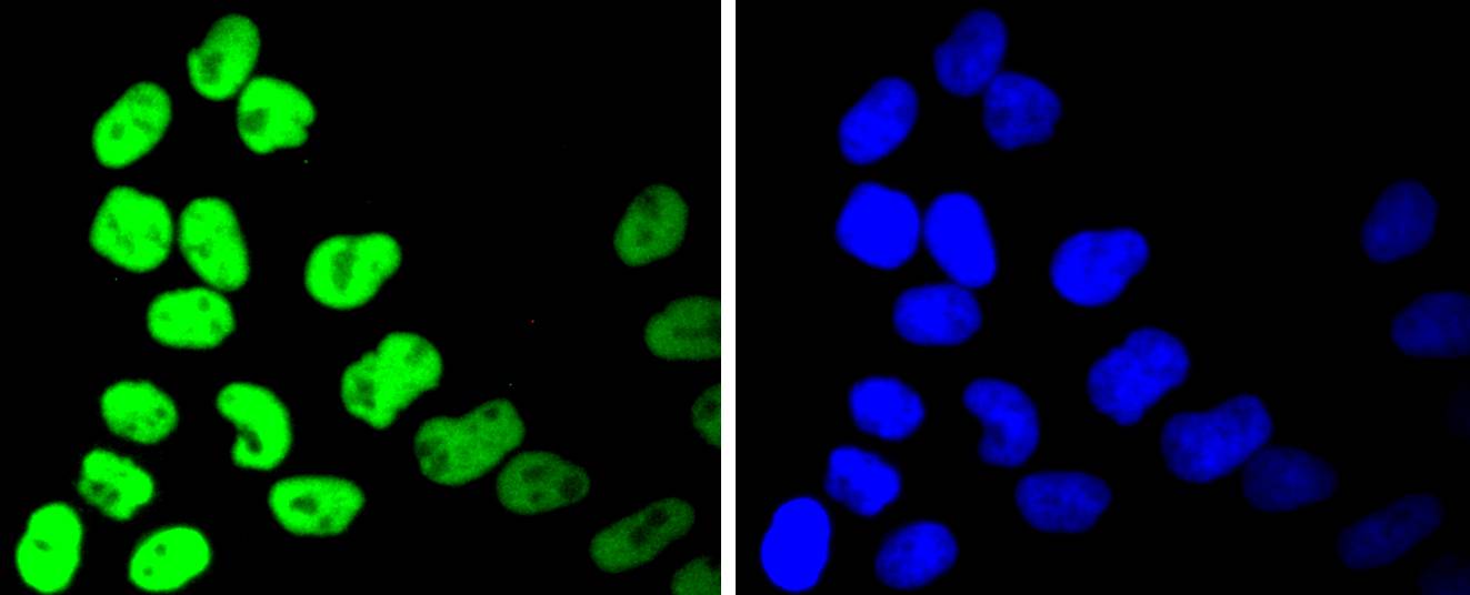 ICC staining HDAC2 in Hela cells (green). The nuclear counter stain is DAPI (blue). Cells were fixed in paraformaldehyde, permeabilised with 0.25% Triton X100/PBS.